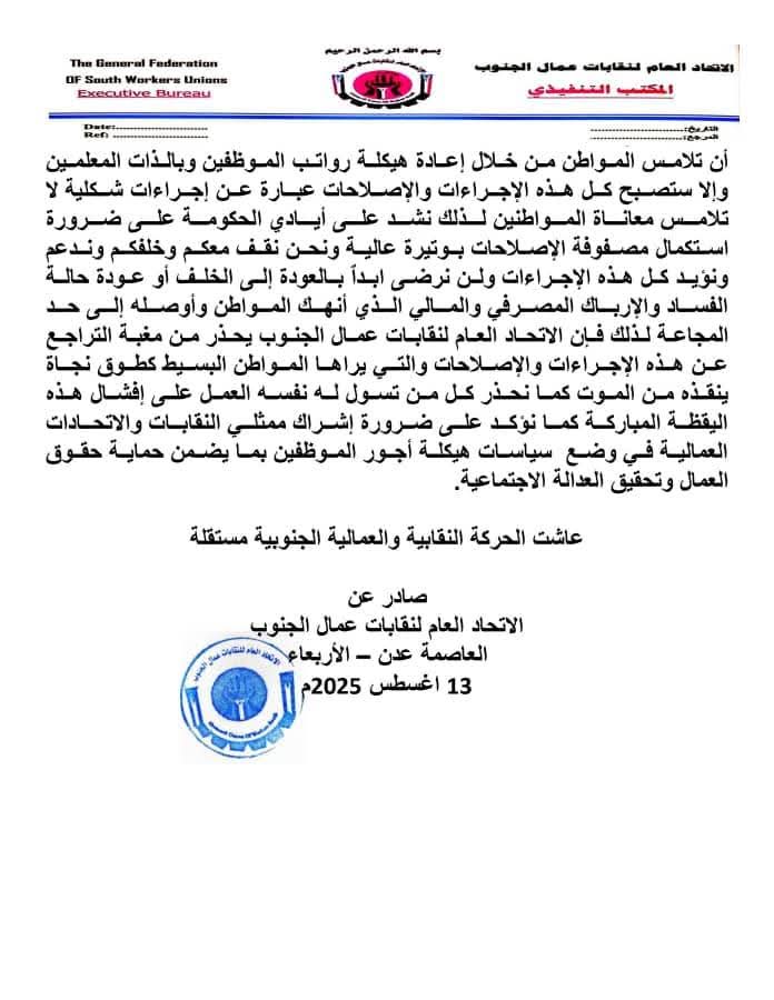 ويؤكد الاتحاد العام لنقابات عمال الجنوب دعمه الكامل لكل الإجراءات التي تصب في مصلحة الشعب ويشدد على أهمية مواصلة هذه الإصلاحات والإجراءات بوتيرة متسارعة وأن تلامس هذه الإجراءات والإصلاحات أرض الواقع والمواطن من خلال إعادة هيكلة رواتب الموظفين وبالذات المعلمين وإلا ستصبح كل هذه الإجراءات والإصلاحات عبارة عن إجراءات شكلية لا تلامس معاناة المواطنين لذلك نشد على أيادي الحكومة على ضرورة إستكمال مصفوفة الإصلاحات بوتيرة عالية ونحن نقف معكم وخلفكم وندعم ونؤيد كل هذه الإجراءات ولن نرضى ابدٱ بالعودة إلى الخلف أو عودة حالة الفساد والإرباك المصرفي والمالي الذي أنهك المواطن وأوصله إلى حد المجاعة لذلك فإن الإتحاد العام لنقابات عمال الجنوب يحذر من مغبة التراجع عن هذه الإجراءات والإصلاحات والتي يراها المواطن البسيط كطوق نجاة ينقذه من الموت كما نحذر كل من تسول له نفسه العمل على إفشال هذه اليقظة المباركة كما نؤكد على ضرورة إشراك ممثلي النقابات والاتحادات العمالية في وضع سياسات هيكلة أجور الموظفين بما يضمن حماية حقوق العمال وتحقيق العدالة الاجتماعية.